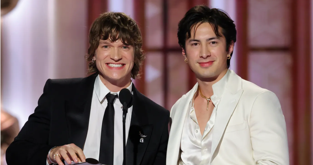Connor Storrie and Hudson Williams present an award at the Golden Globes.