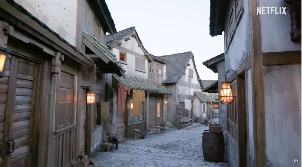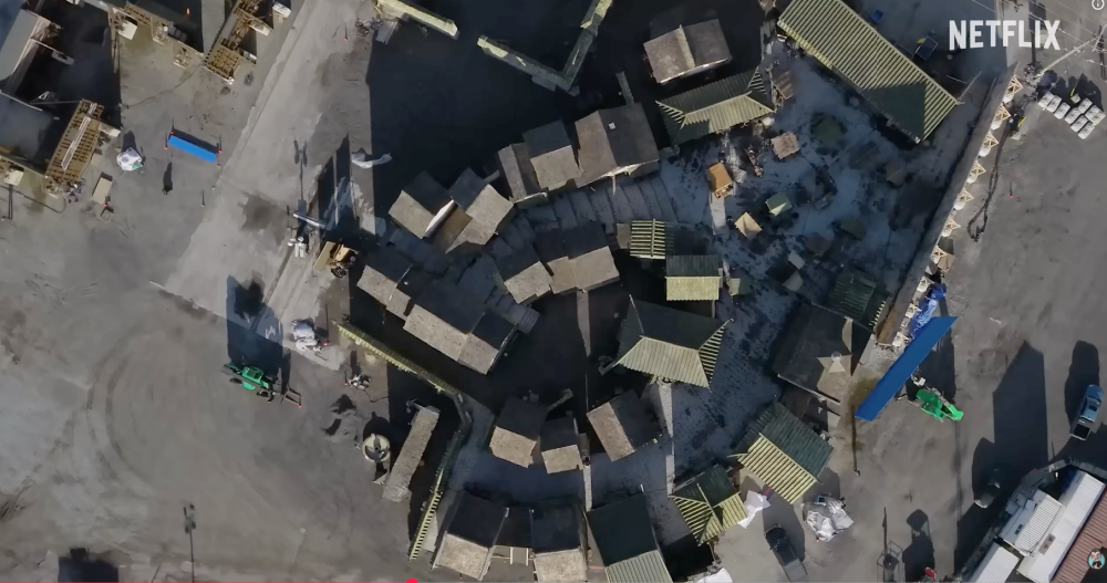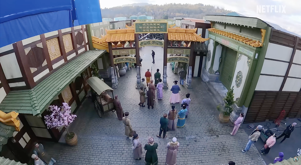 Crew built an outside Asian palace set and village set on an epic scale at the Flavelle Mill backlot in Port Moody in 2024, adapting and expanding Shogun’s existing feudal Japan set.