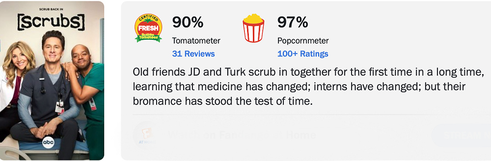 Fifteen years on, the Scrubs revival premiere, starring Zach Braff as J.D.,, delivered the top-performing ABC comedy episode, top ABC series debut overall on streaming in over a year and 9 million cross-platform views over seven days.